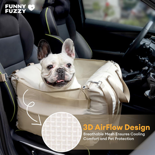 FUNNY FUZZY Waterproof Dog Car Seat for Small & Medium Dogs Up to 35lbs, Detachable & Washable Pet Booster Seat with Leash, Thick Cushion, Storage Pockets & Adjustable Straps (Beige)